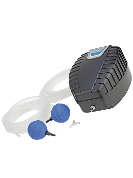 RĂŒckschlagventile ermöglichen den Betrieb unterhalb des Wasserniveaus. Die Luftfördermenge von 500 Litern pro Stunde strömt ĂŒber zwei Ausströmersteine, die jeweils ĂŒber einen 5 m-Schlauch mit der Pumpe verbunden sind, aus. Die Luftmenge versorgt kleinere bis mittelgroĂe Gartenteiche bis 5 cbm Wasserinhalt ausreichend mit Sauerstoff.