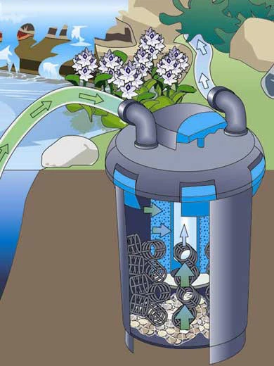 | Reinigungsgriff Einfachste Wartung durch im Deckel integriere Reinigunsfunktion |  | Schnellverschluss FĂŒr das einfache Ăffnen und SchlieĂen des Filters. | Unterschiedliche Filtermaterialien Das Filtergestein im Netzbeutel bietet ausreichend BesiedelungsoberflĂ€che fĂŒr Filterorganismen. Bioballs, mit der speziell entwickelten StrömungsfĂŒhrung, bieten neben den FilterschwĂ€mmen nochmal zusĂ€tzliche FilteroberflĂ€che und befinden sich frei beweglich im Wasserstrom. |  | Integrierte UVC-Einheit Das integrierte UVC sorgt fĂŒr die rasche Beseitigung von Algen und Krankheitserregern im Teichwasser. |