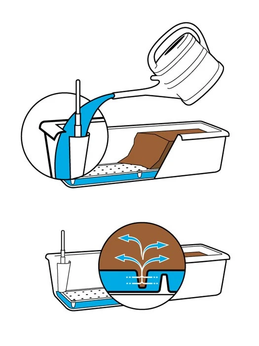 • Ăśberlauföffnung im Wasserspeicher (ĂĽberschĂĽssiges Wasser – durch zu starkes GieĂźen oder Regen verursacht – kann ablaufen, dadurch kein Ăśbernässen der Erde).