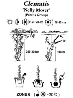 | Besonderheiten, Pflege: | Keine StaunĂ€sse. Bei der Pflanzung den Ballen eine Handbreit unter die ErdoberflĂ€che setzen. RĂŒckschnitt: siehe Pflanzung und Pflege von Clematis |