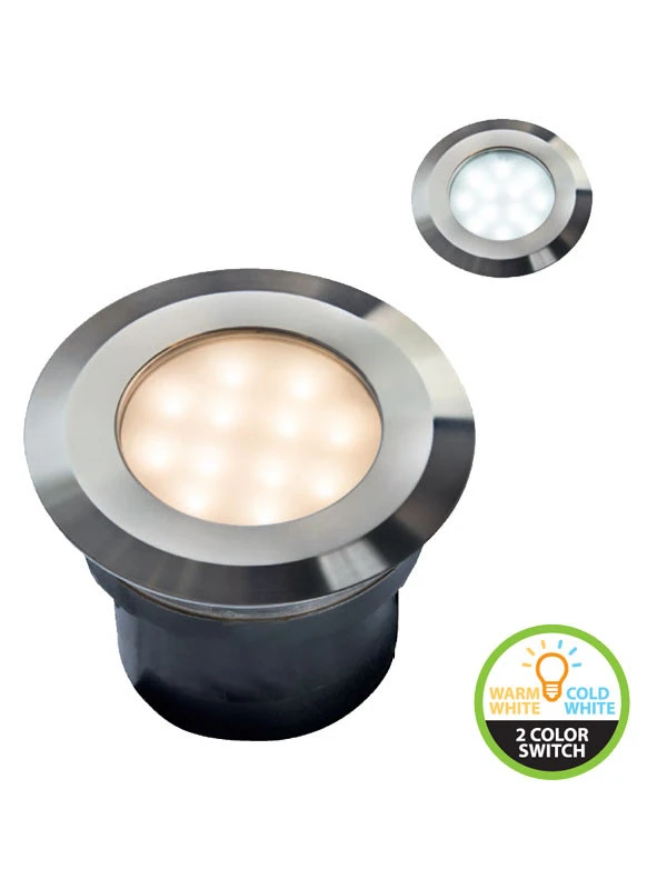 Edle, runde Einbauleuchte aus hochwertigem Edelstahl zum Einbau in Holzdielen an der Terrasse. Das Leuchtmittel lässt sich von warmweiß auf kaltweiß umschalten.