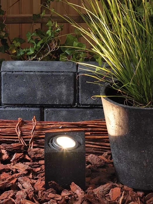 Der Spotstrahler ‚Cylon‘ kann einfach an einem beliebigen Ort im AuĂźenbereich postiert werden und sowohl zur sicheren Beleuchtung als auch zur Anstrahlung besonderer Elemente im Garten dienen.