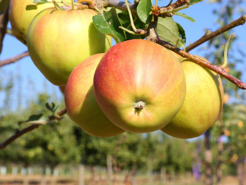 Frucht: Die Früchte vom Apfel Tramin färben sich gelblich mit roten Streifen. Sie leuchten förmlich und peppen die Krone des Apfelbaums im Herbst noch einmal so richtig auf. Besonders fällt das ausgewogene Verhältnis zwischen Zucker und Säure auf. Daher sind diese Äpfel auch besonders bekömmlich. Nach der Ernte Mitte bis Ende September können Sie die Äpfel noch über zwei bis drei Monate lang in Ihrem dunklen und kühlen Keller problemlos lagern.