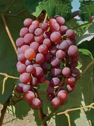 | Frucht: | GroĂe, lockere rote Trauben mit groĂen, hellgelben, knackigen, kernlosen Beeren mit angenehmem Biss. |